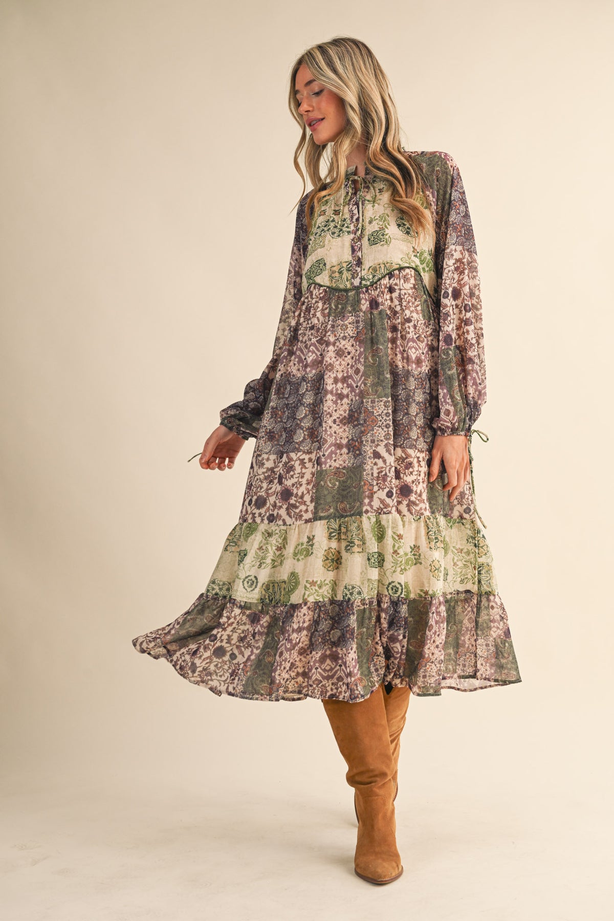 Artful and distinctive, this patchwork midi dress blends a variety of prints for a beautifully layered look. The velvet piping adds a refined touch, while the ruffled neckline and flowing tiered skirt create an effortless silhouette. Designed with puff sleeves and convenient pockets, this dress offers a unique style that feels both comfortable and thoughtfully detailed.