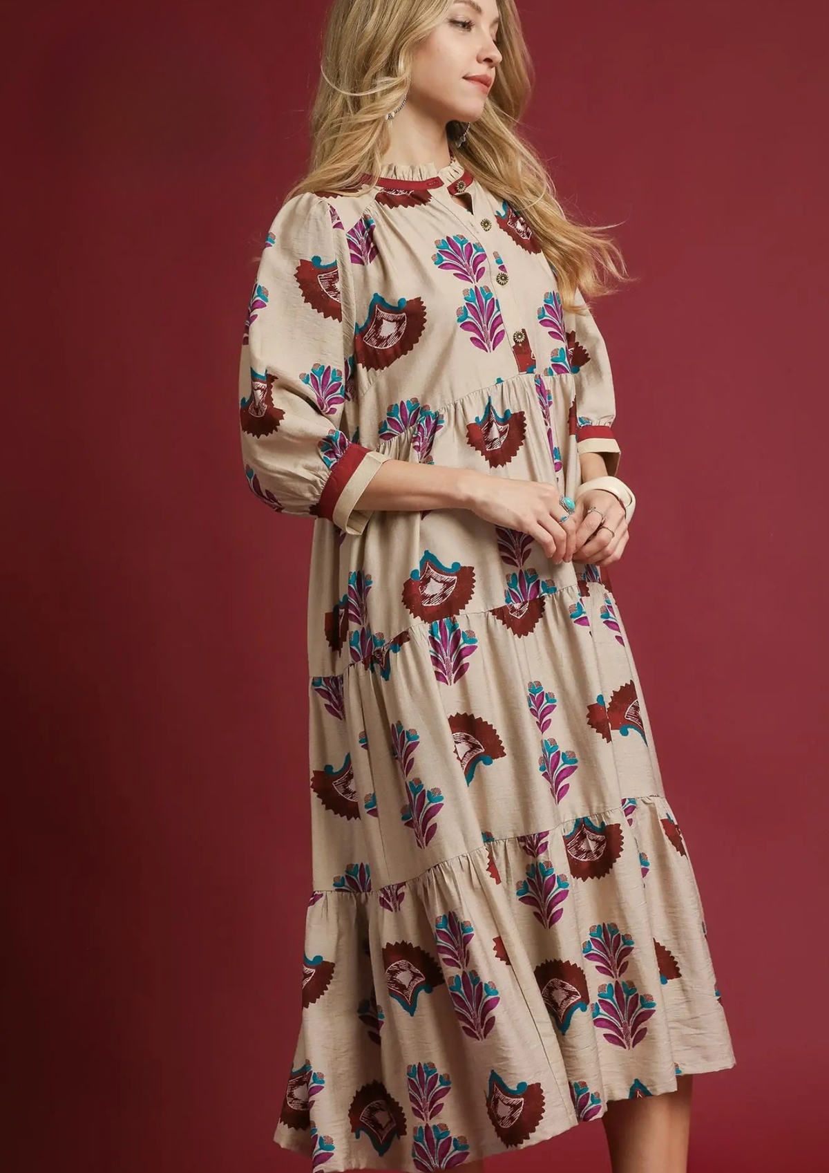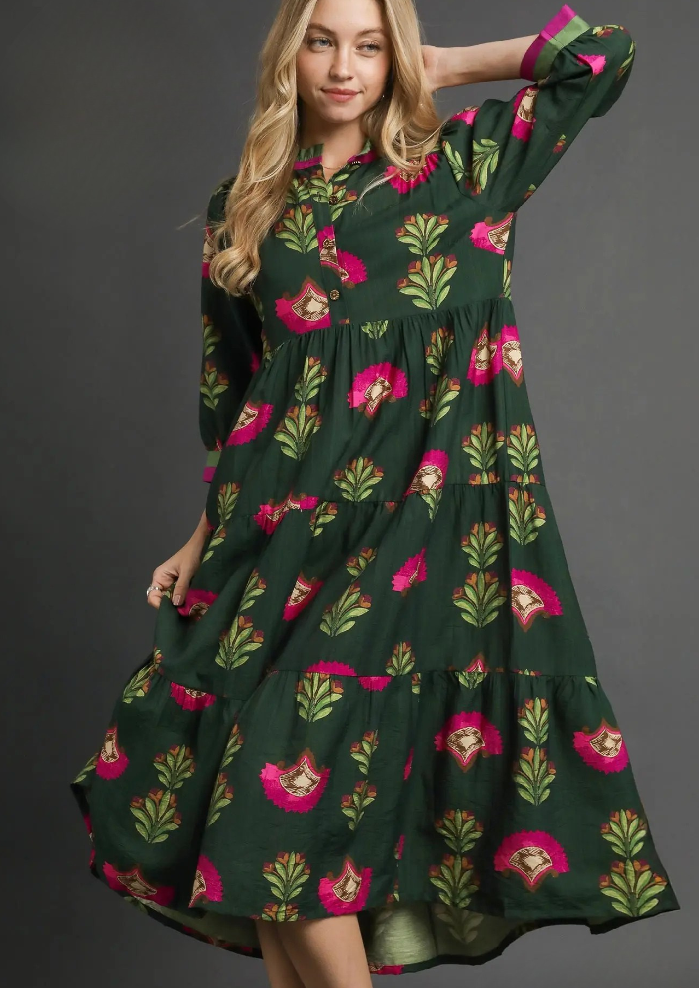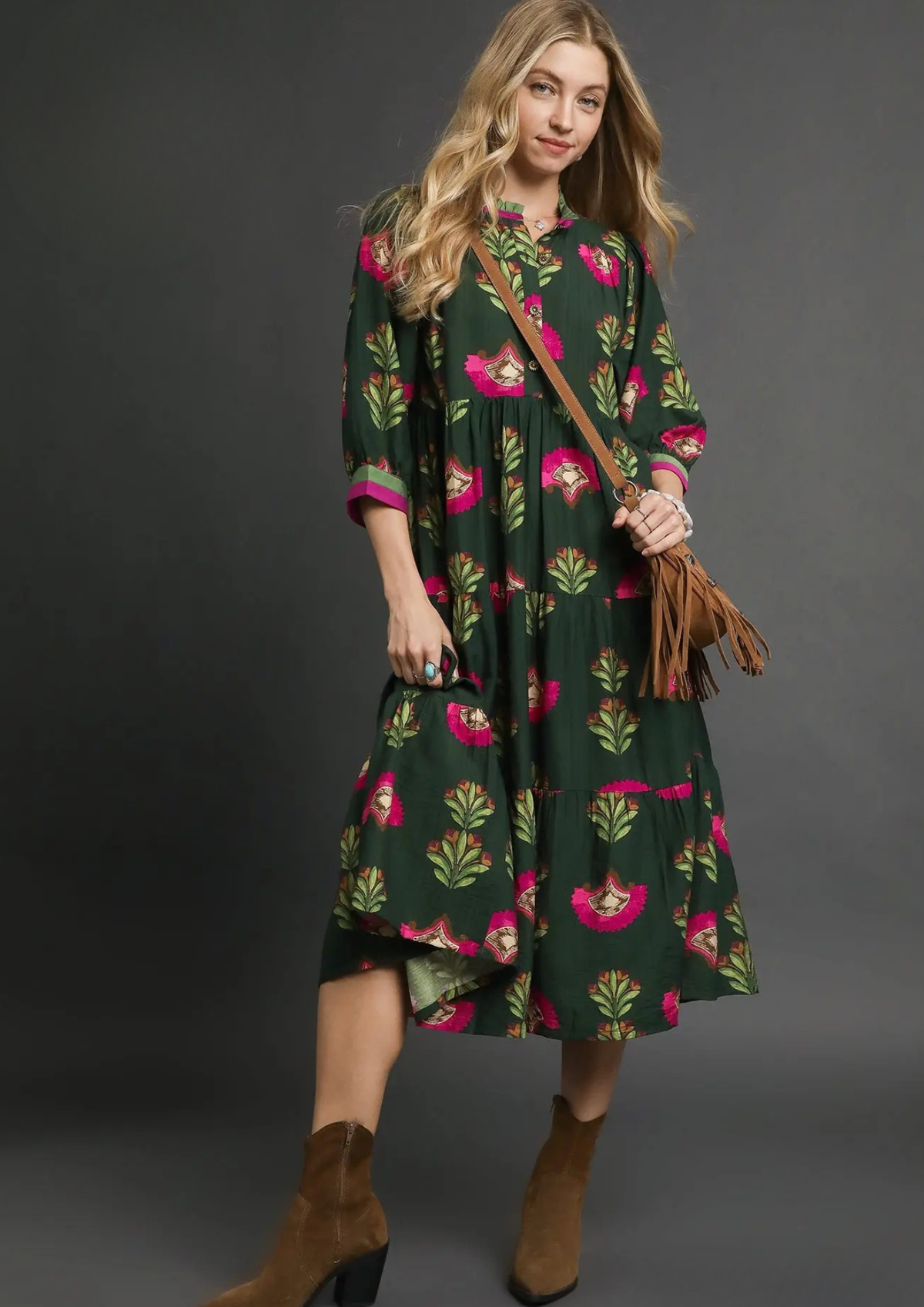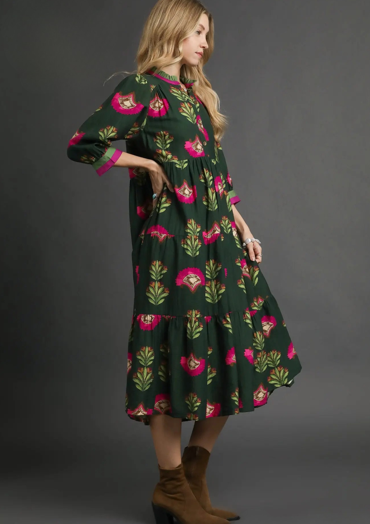 This dress pairs a bold botanical print with a classic, easy-to-wear silhouette. Perfect for autumn outings, casual gatherings, or dressing up with boots and accessories for a chic seasonal look.