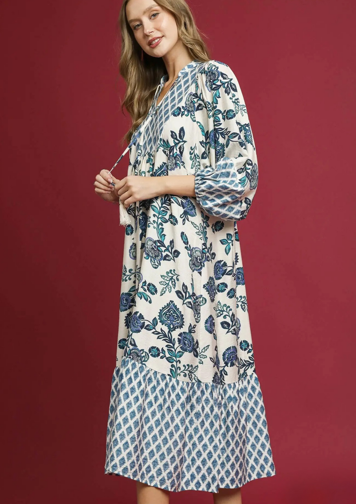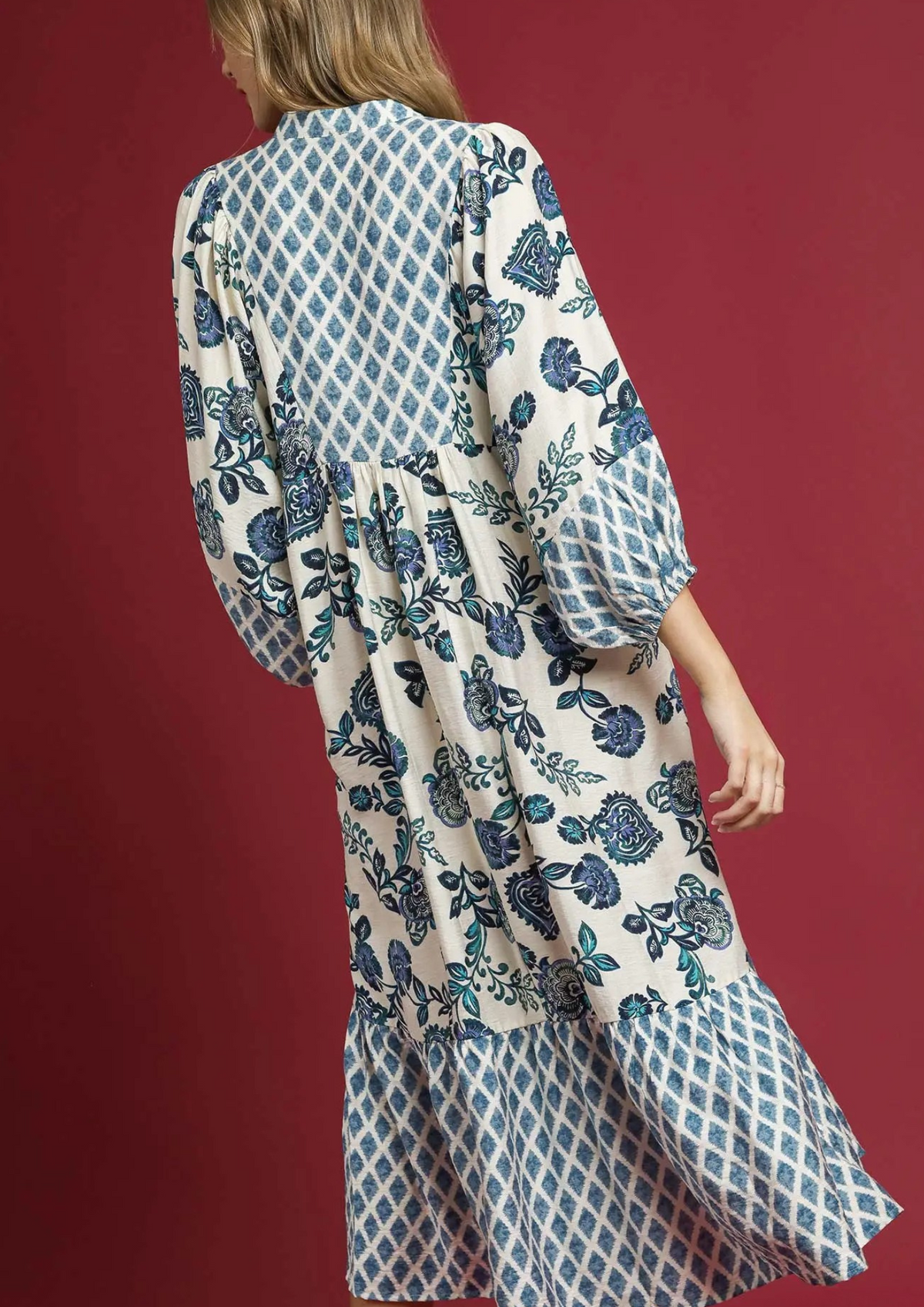 Elegant and bohemian-inspired, this mixed print midi dress brings a refreshing touch of artistry to your wardrobe. The contrasting patterns combine floral motifs with geometric detailing, creating a bold yet feminine aesthetic. Designed with a flowy tiered hem, balloon sleeves, and a relaxed silhouette, this piece ensures all-day comfort while making a statement. Perfect for seasonal transitions, it can be styled with boots for fall or sandals for spring and summer outings.