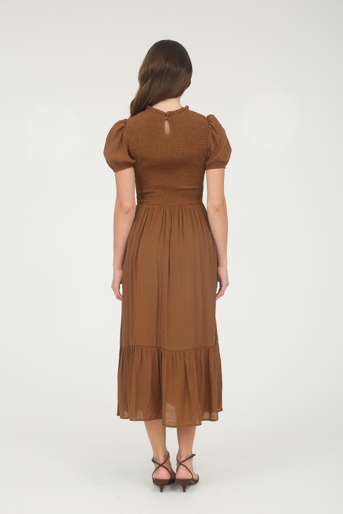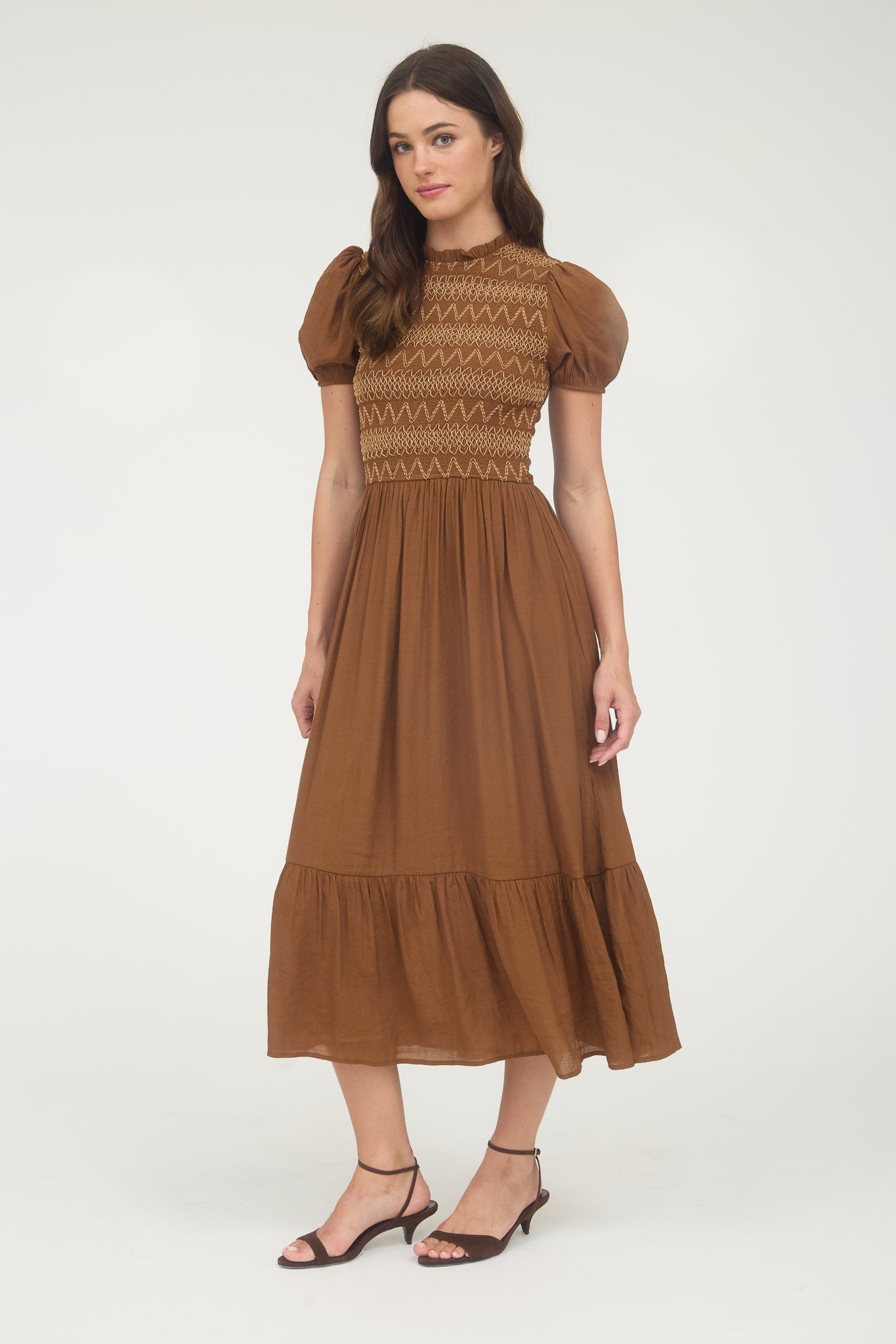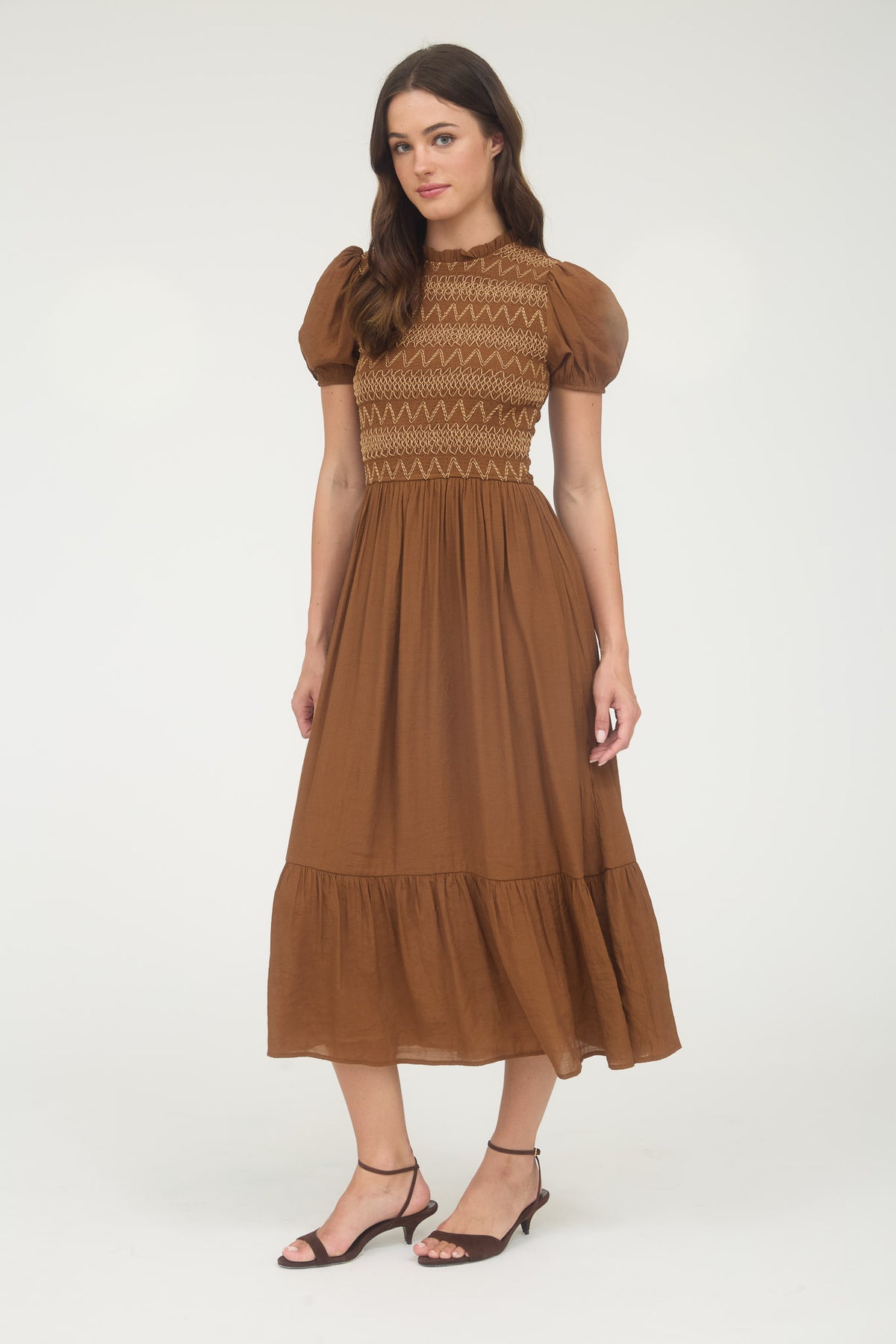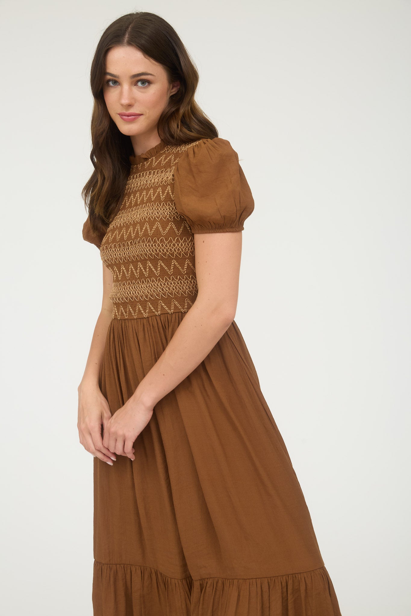 A beautifully detailed midi dress with a timeless silhouette, this piece blends soft puff sleeves with an intricate contrast-smocked bodice for a touch of handcrafted charm. The rayon-blend fabric drapes effortlessly, flowing into a tiered skirt that moves gracefully with every step. Feminine, flattering, and easy to style, it’s the perfect dress for Sundays, special gatherings, or any day you want to feel effortlessly put-together.
