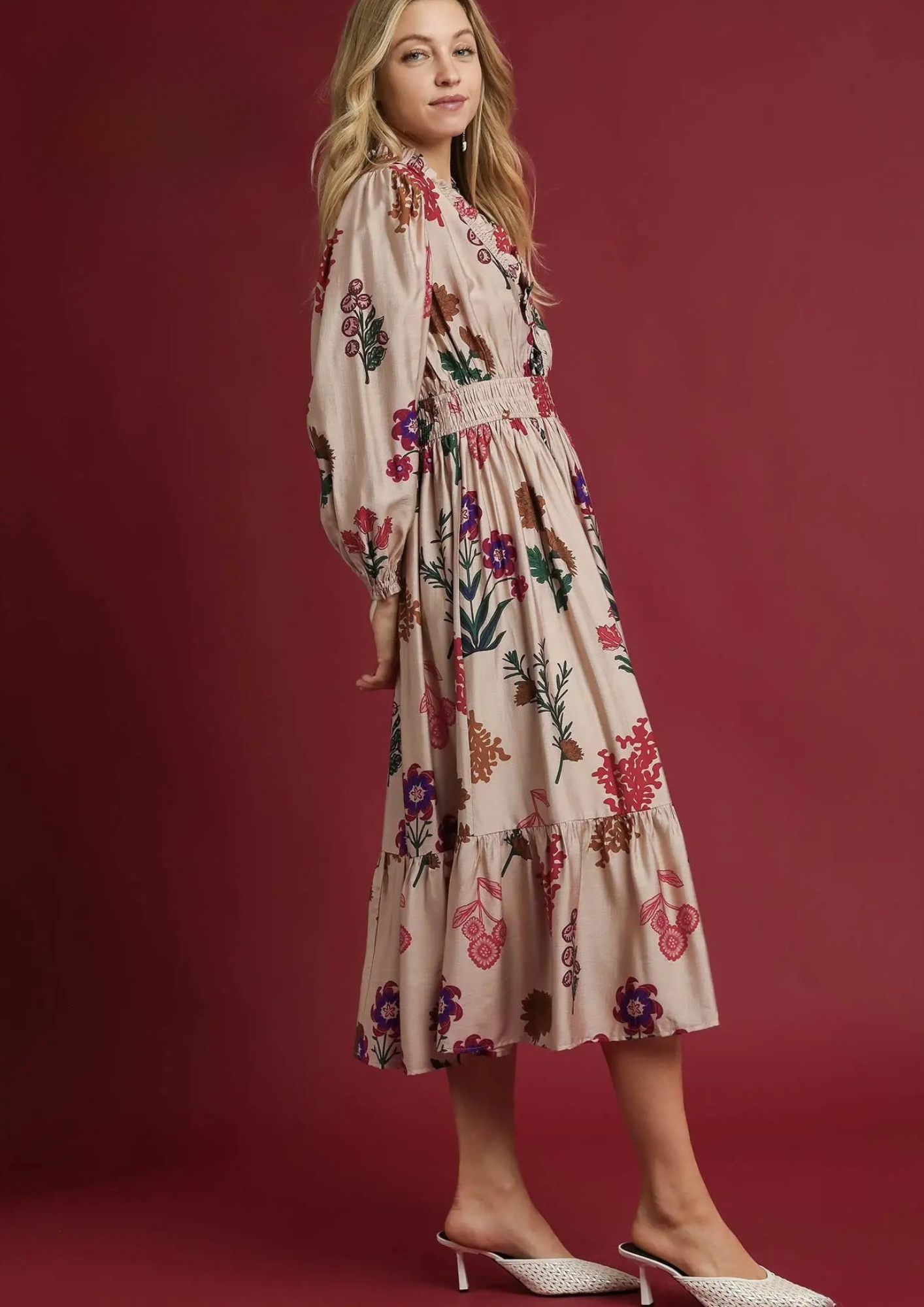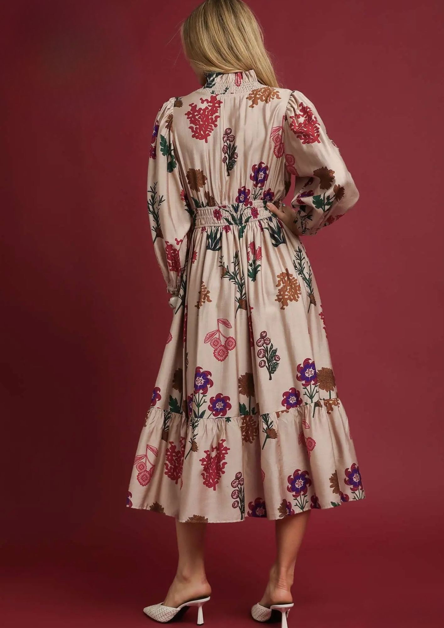Bring effortless charm to your wardrobe with the Mix Floral Print Midi Dress. Designed with a ruffled V-neckline, smocked waist, and tiered silhouette, this dress combines femininity and comfort in one timeless look. The lined skirt ensures ease and confidence, making it perfect for brunches, garden parties, or boutique-ready everyday elegance.