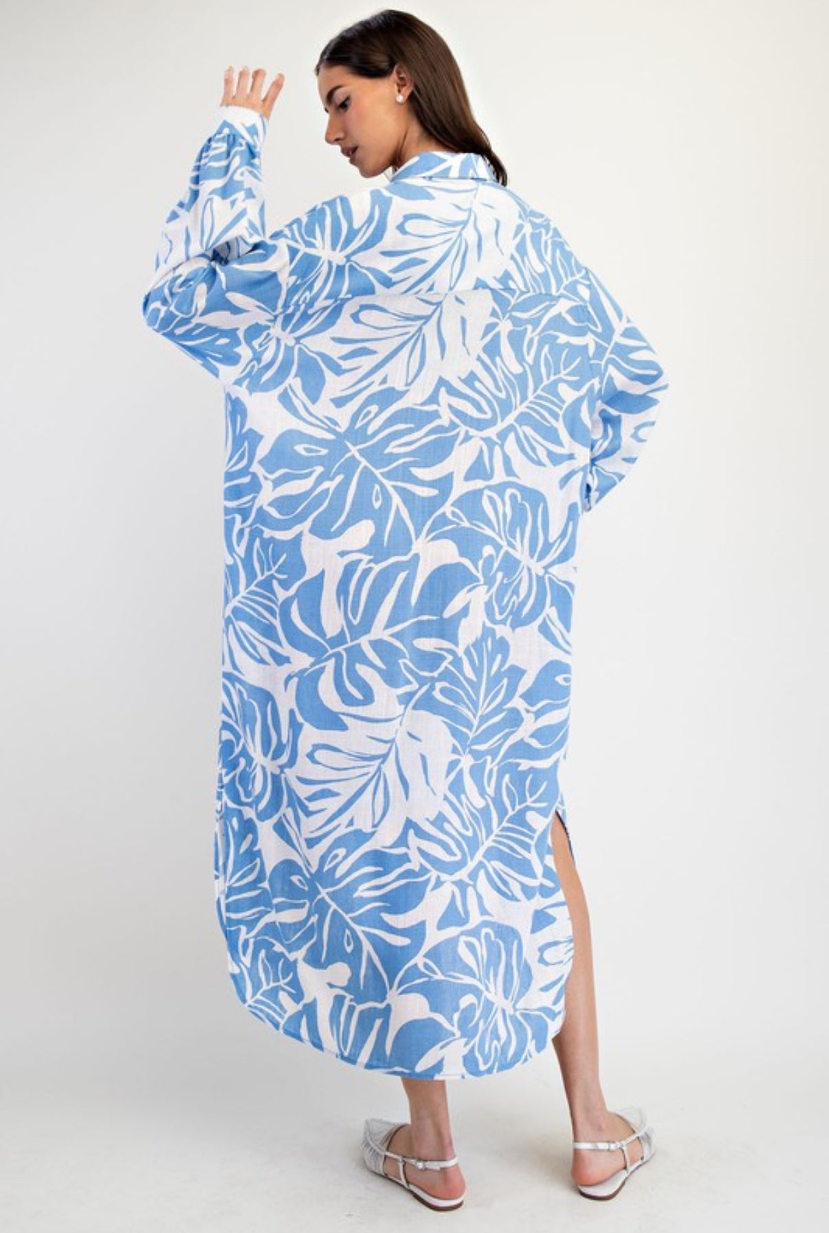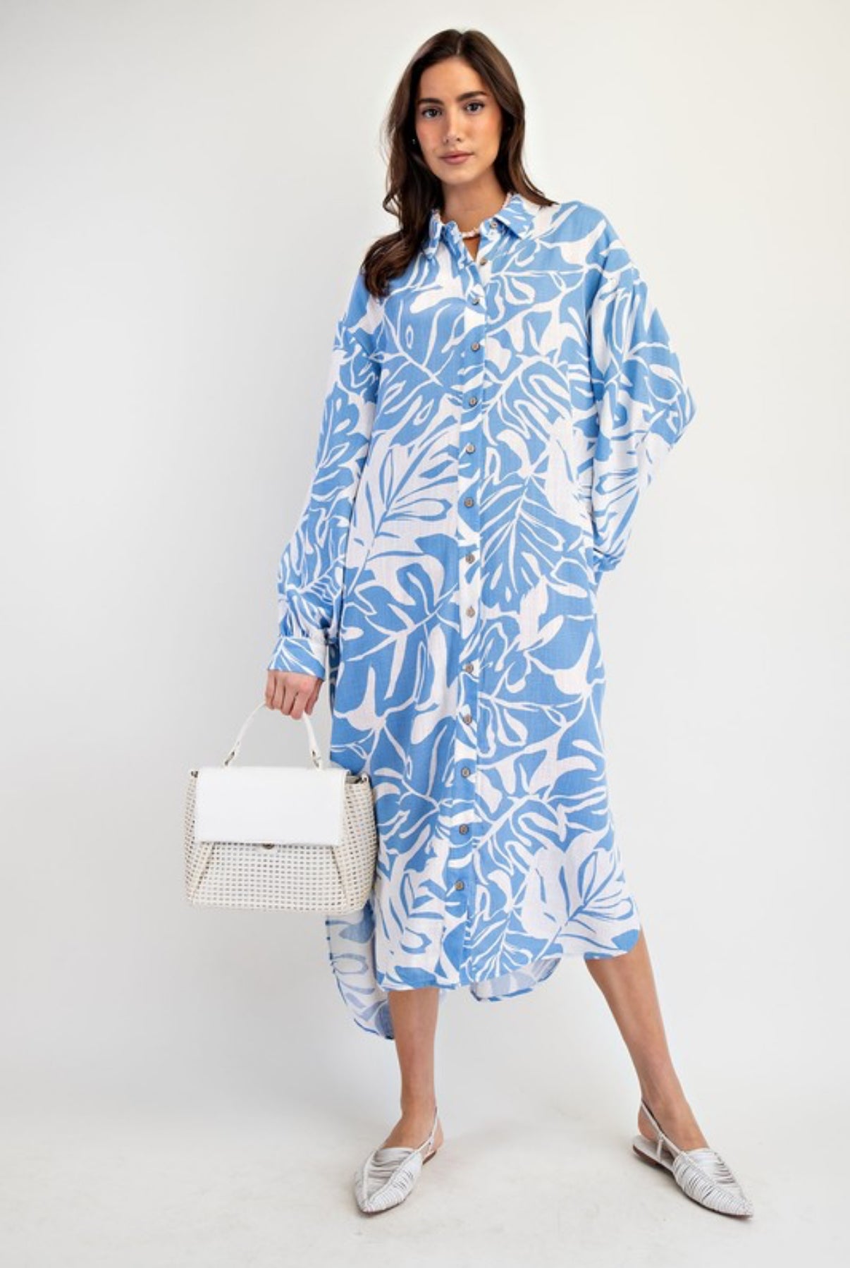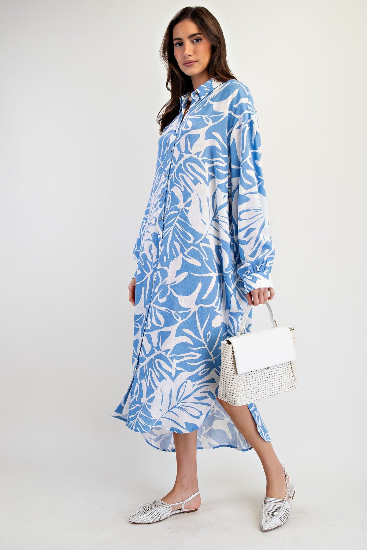 A breezy, elevated essential that brings effortless elegance to your wardrobe. Perfect for warm days, beach getaways, or everyday layering, this printed shirt dress pairs beautifully with sandals or flats for a polished, easygoing look.