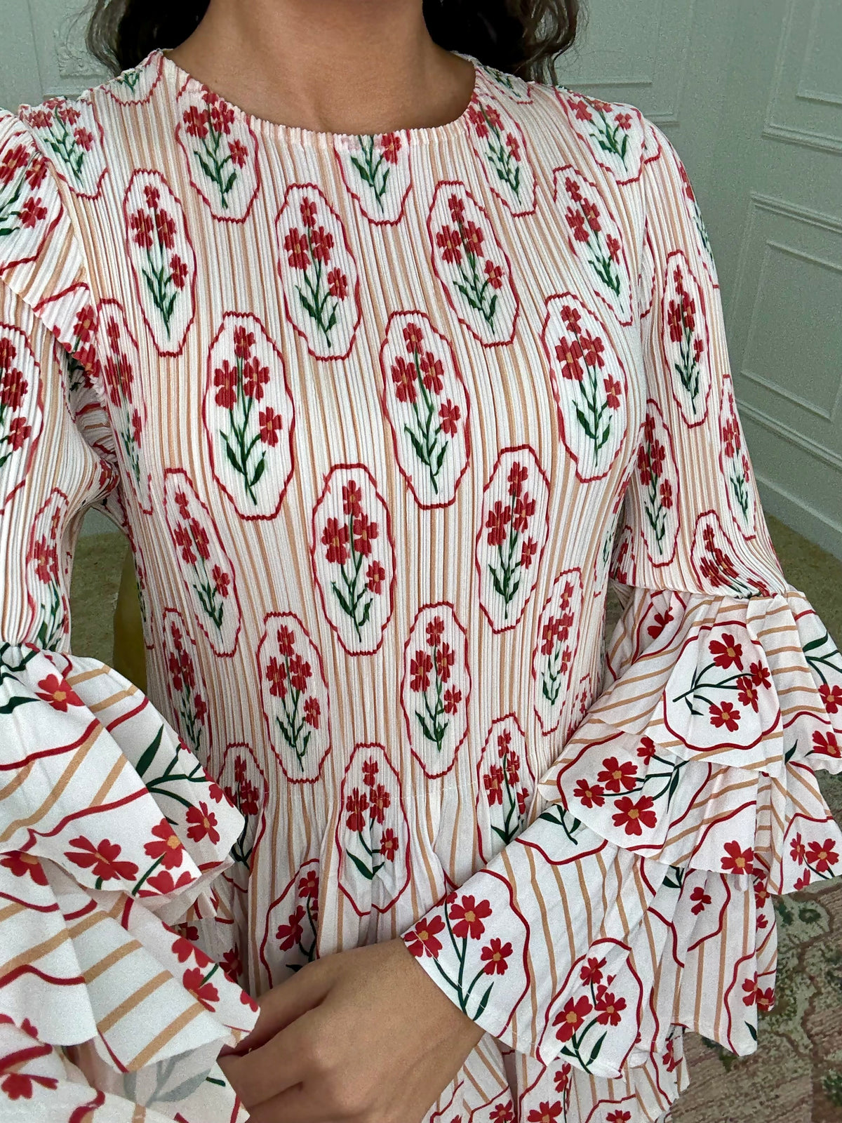 Wash separately on cold delicate cycle and air dry. Do not dry clean or use a dryer. If your item arrives with wrinkles, gently steam in a vertical motion. Avoid steaming pleats to avoid damage.