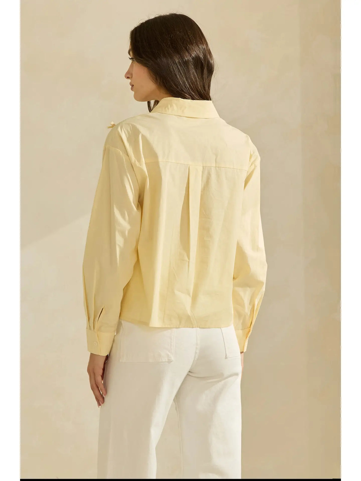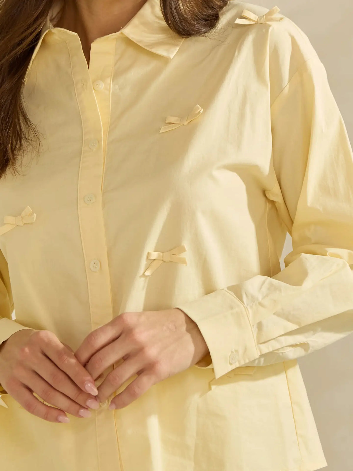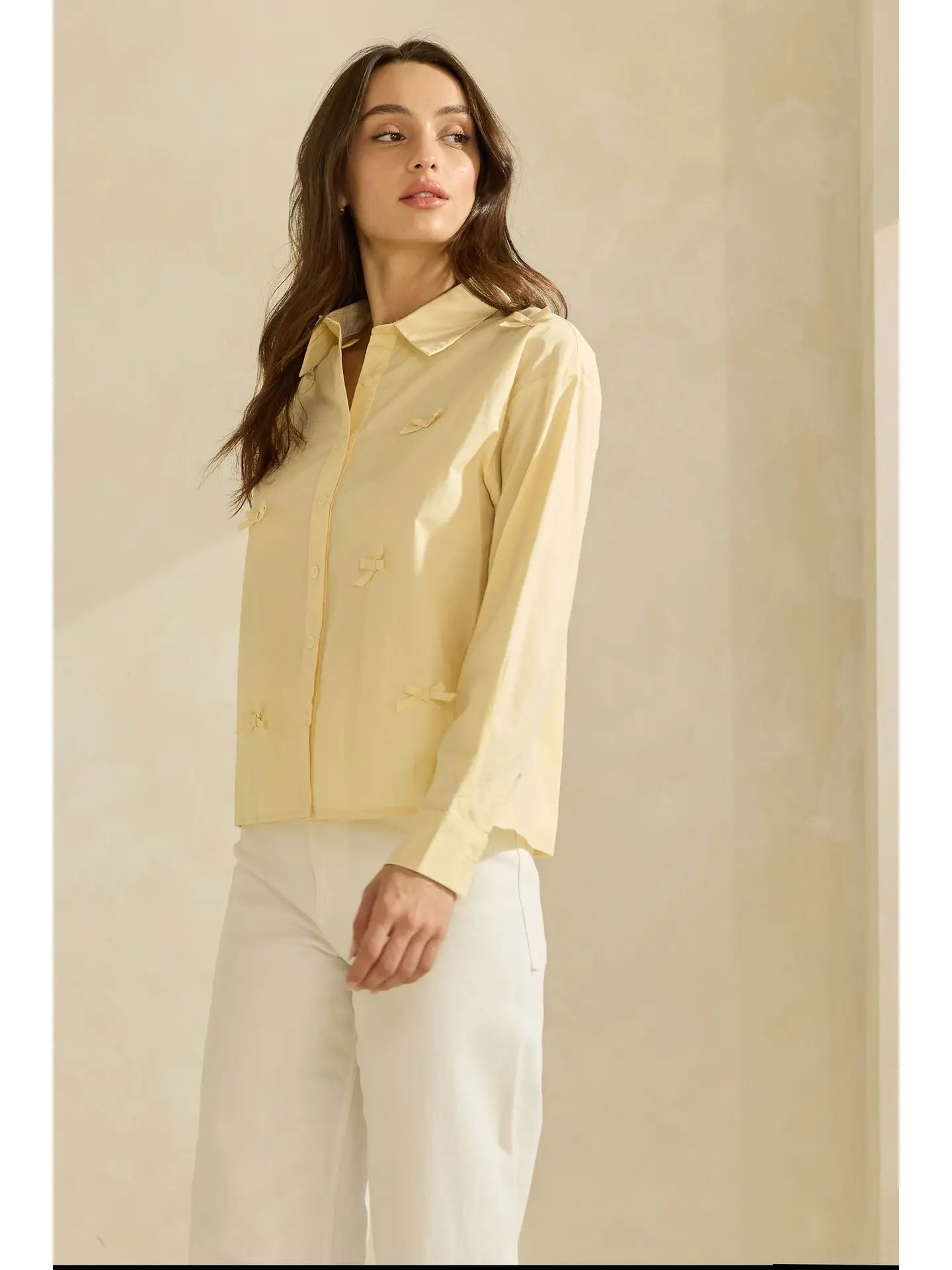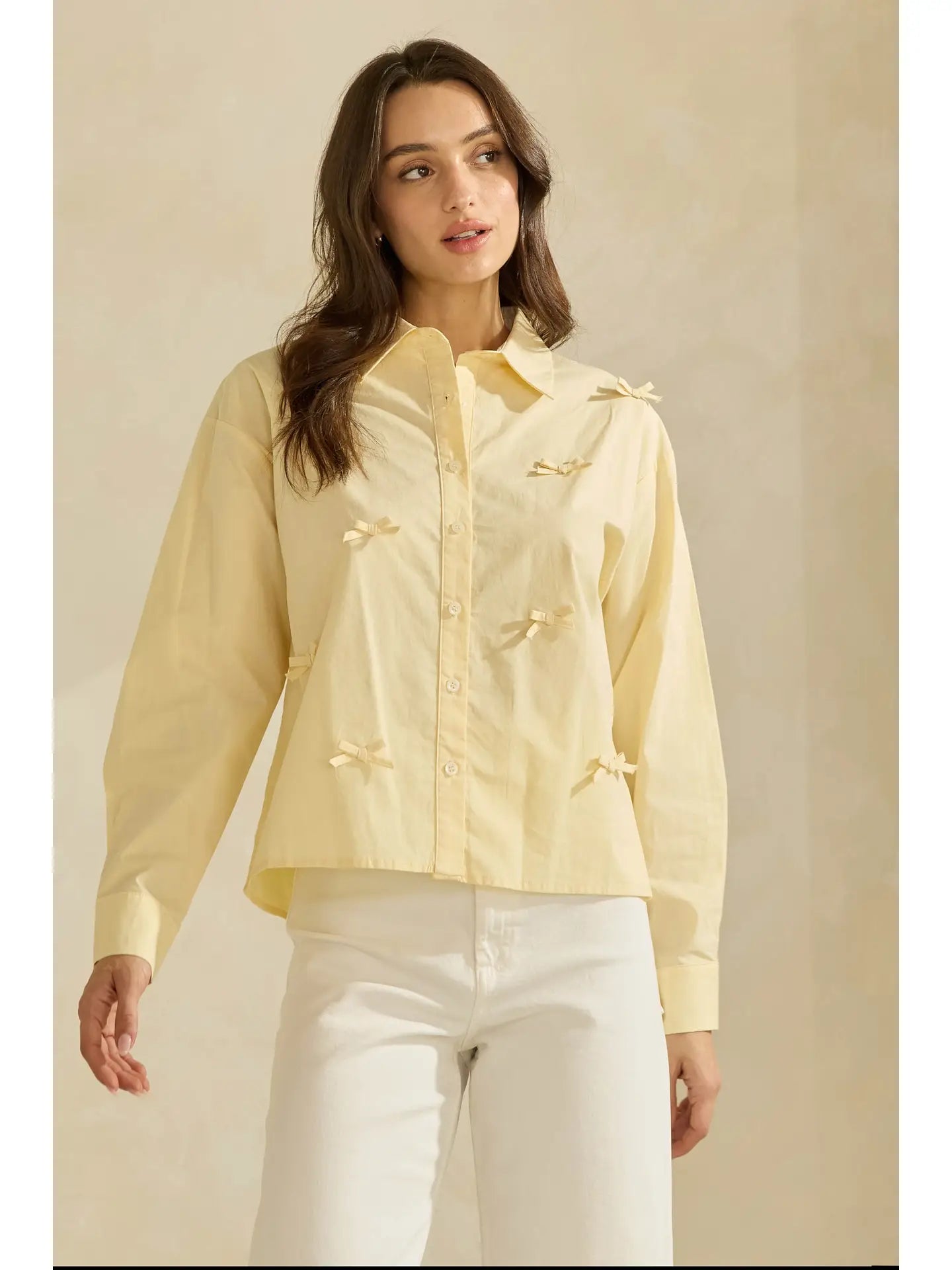 Soft and feminine with a charming touch, this butter-yellow blouse features delicate bow embellishments that add subtle texture and personality. The classic button-up design and crisp collar create a polished look, while the lightweight cotton fabric keeps it comfortable for everyday wear. Easy to pair with denim, skirts, or tailored pieces, this blouse offers a sweet yet refined style that feels effortlessly put together.